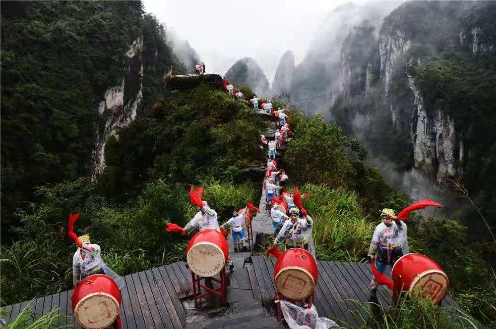 在湖南湘西土家族苗族自治州吉首市德夯天問臺(tái),苗族演員在表演苗鼓舞(2018年10月20日攝)
