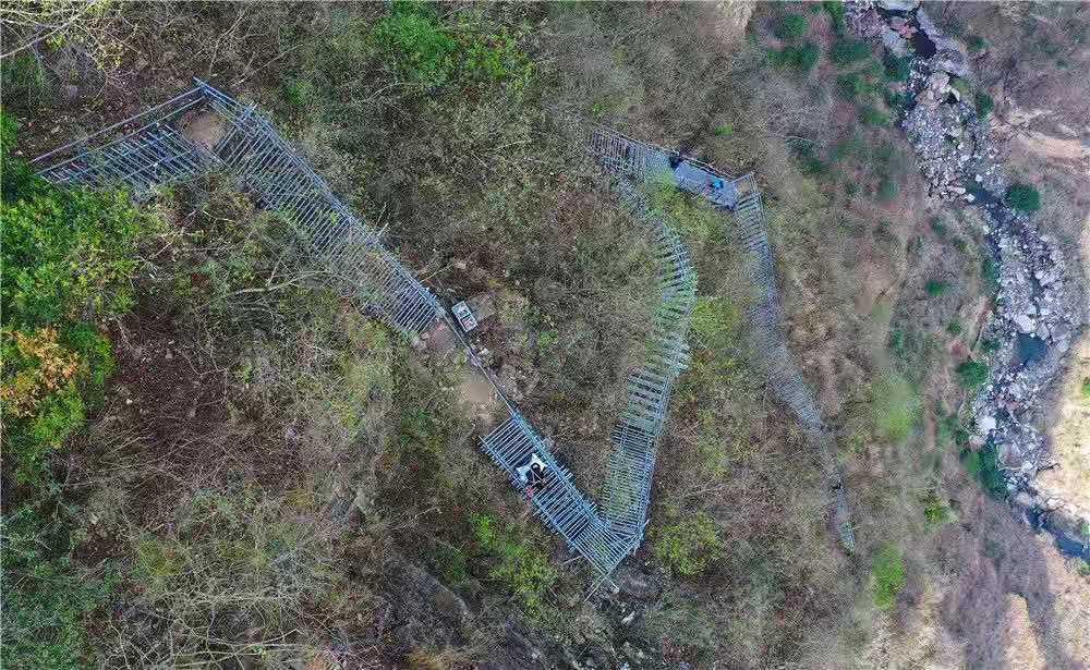 在四川省涼山彝族自治州昭覺縣阿土列爾村的懸崖鋼梯上,村民沿著鋼梯下山(2020年5月13日攝,無(wú)人機(jī)照片)
