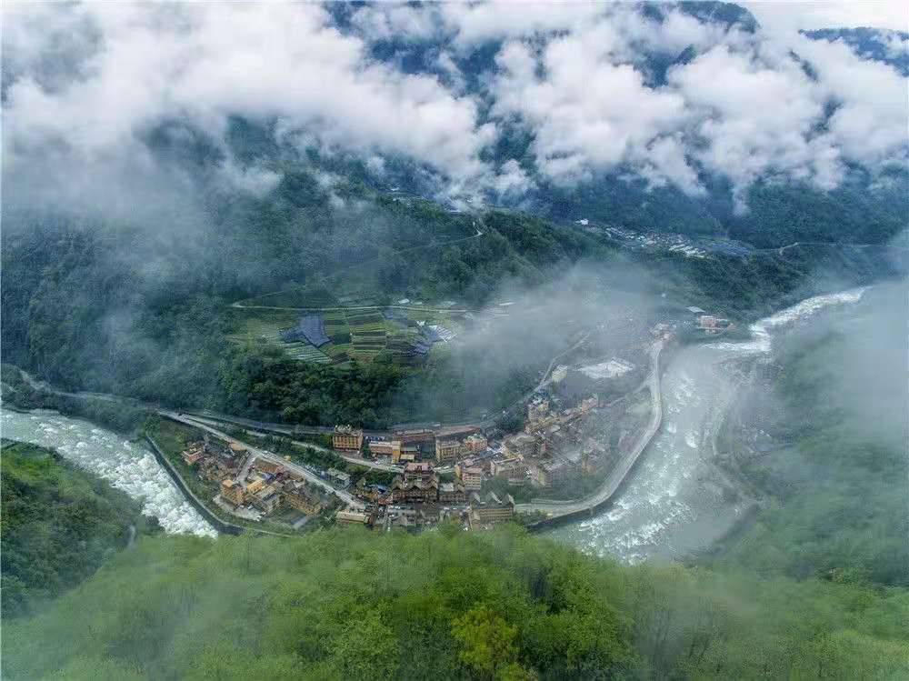 云霧繚繞的云南貢山獨(dú)龍族怒族自治縣獨(dú)龍江鄉(xiāng)(2019年4月16日攝,無(wú)人機(jī)照片)