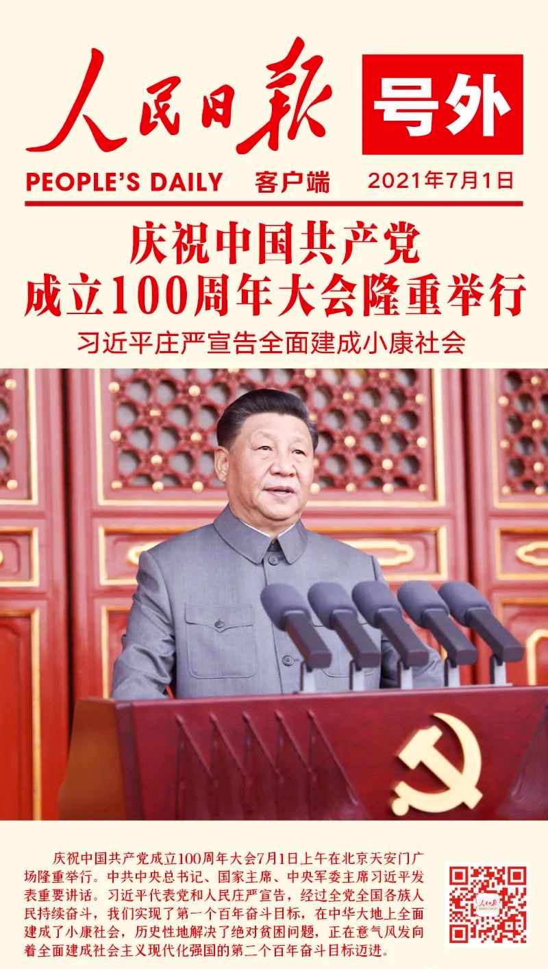 今天,在中國(guó)共產(chǎn)黨歷史上,在中華民族歷史上,都是一個(gè)十分重大而莊嚴(yán)的日子。我們?cè)谶@里隆重集會(huì),同全黨全國(guó)各族人民一道,慶祝中國(guó)共產(chǎn)黨成立一百周年,回顧中國(guó)共產(chǎn)黨百年奮斗的光輝歷程,展望中華民族偉大復(fù)興的光明前景。