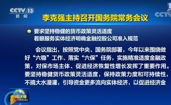 李克強主持召開國務(wù)院常務(wù)會議 要求堅持穩(wěn)健的貨幣政策靈活適度 著眼服務(wù)實體經(jīng)濟明確金融控股公司準入規(guī)范等